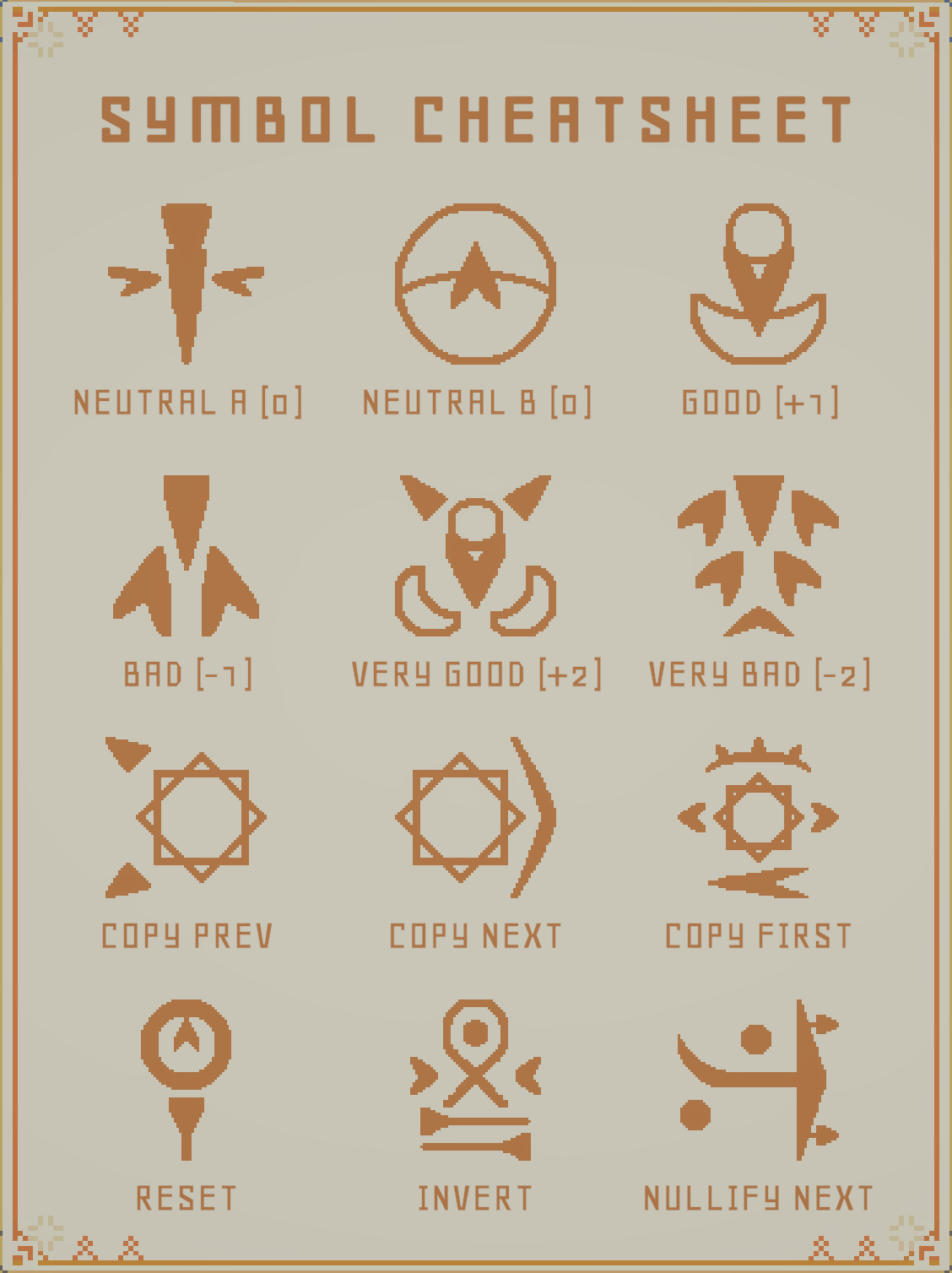 Symbols either have a value or an action tied to them. They interact with each other to form the emotional tone of a sentence, and are read from left to right. Placement matters! Changing the order of symbols can drastically change how a message is understood. (If you get stuck, there is a symbol cheat sheet below).